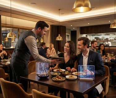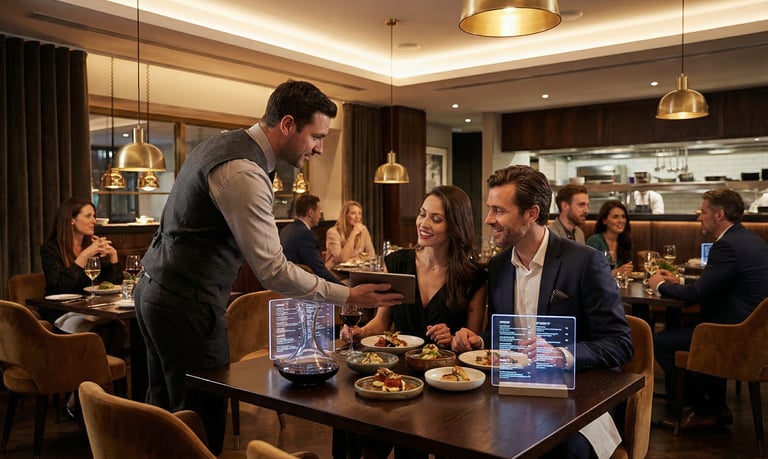 Ejemplo: menú interactivo que destaca un plato especial y su maridaje recomendado, acompañado de música o iluminación específica.